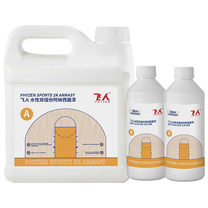 Phyzen Sport 2K Annasy is a water-based topcoat specifically designed for sports wood flooring,using nanotechnology two-component resin.It is mainly used as a topcoat for sports wood flooring. This product is designed specifically for the highest anti slip requirements of sports wooden flooring..This product complies with the GB18581-2020 standard.The hardness, elasticity, adhesion,wear resistance, and anti-corosion and rust prevention ofthis product are at a high-quality level among similarproducts. This product is a special fommula that does notcontain matting agents or wax, making old and damagedwooden floors look brand new. After using this product, thesurface of the wooden floor can also be treated with Anaxitwo-component paint through a re coating process.